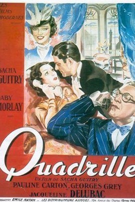 Quadrille (1938) 又名: 四对舞 这是一部充满对话的四人情事,充分展示了编剧兼导演萨沙·吉特里的机智。吉特里饰演一位杂志编辑,他交往多年的女友(他希望她成为他的未婚夫)被一位英俊的美国电影明星不可控制地吸引住了。与此同时,一位眼光敏锐的记者(杰奎琳·德鲁巴克饰)兴致十足地旁观着,并为这个浪漫的长方形提供了最后一个角落。