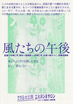 風たちの午後 (1980) 又名: Afternoon Breezes 一起住在都市公寓的两位女性,美津和夏子。开始偷偷爱上美津的夏子,想把美津占为己有,接近她的恋人,怀上了孩子。美津离开了夏子,夏子却一直追在她身后……。以强有力的演出展现微妙心理剧的佳作。